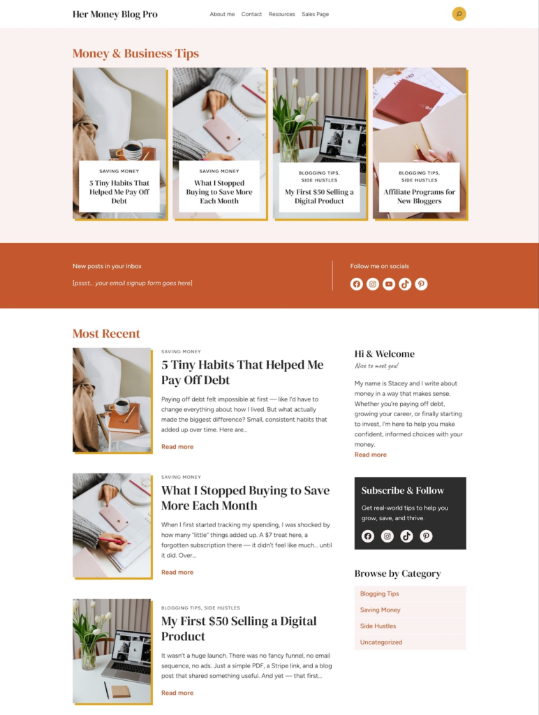 Her Money Blog is a feminine WordPress block theme designed for bloggers and creators who write about personal finance, side hustles or online business. It’s perfect if you want to turn your blogging into a business!